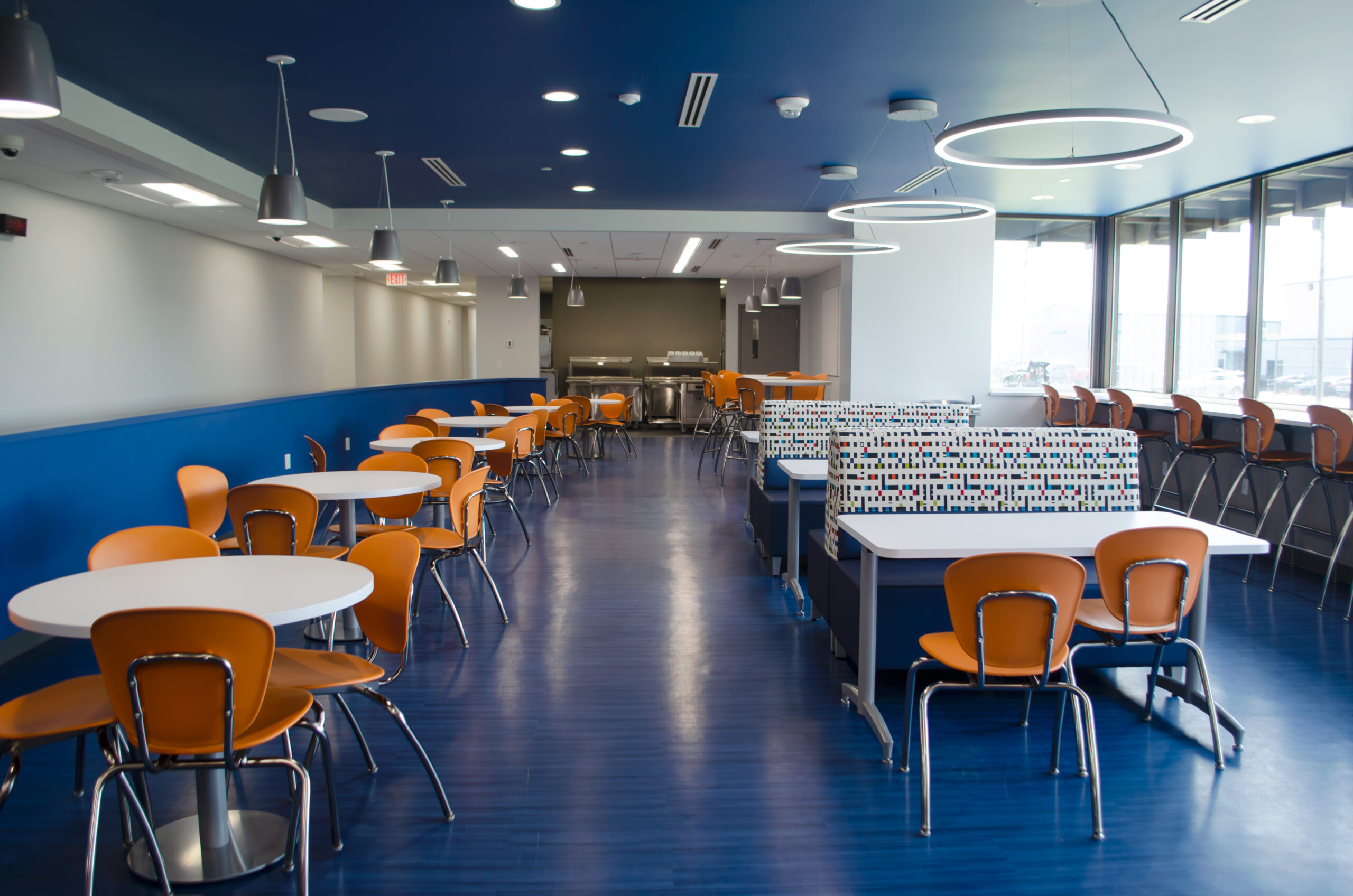 Students explore and learn practical skills in several industries such as aviation, aeronautics, animal science, wildlife management, urban agriculture, and environmental sustainability. They have the opportunity to earn college credit, industrial credentials, and associate degrees in those fields. We were challenged to create a productive, open environment with an appropriate personality to reflect this “school like no other”. Modular upholstered seating for collaborative spaces, chairs on wheels and tables that move replaced conventional desks much to the delight of the students. Bistro tables and stools along with upholstered booths allow the café space to serve as both a dining and study hall with a view of the airport.