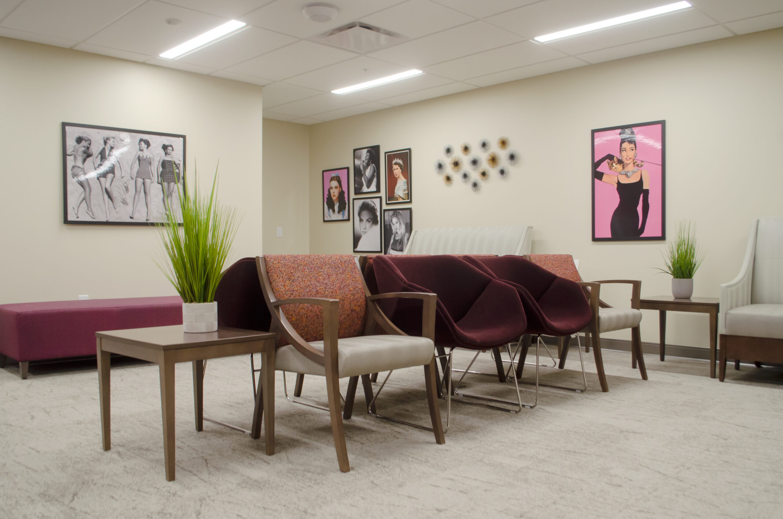 Columbus OBGYN’s new Grove City location, opened in February 2019, showcases excellence in healthcare interior design. The layout features specialized waiting room seating and employs bright orange conference room seating and breakroom design to add a fun element. The physician’s lounge offers peace with a floral-cushioned sofa and mobile lounge chairs, all spaces unified by vibrant artwork and color pops.