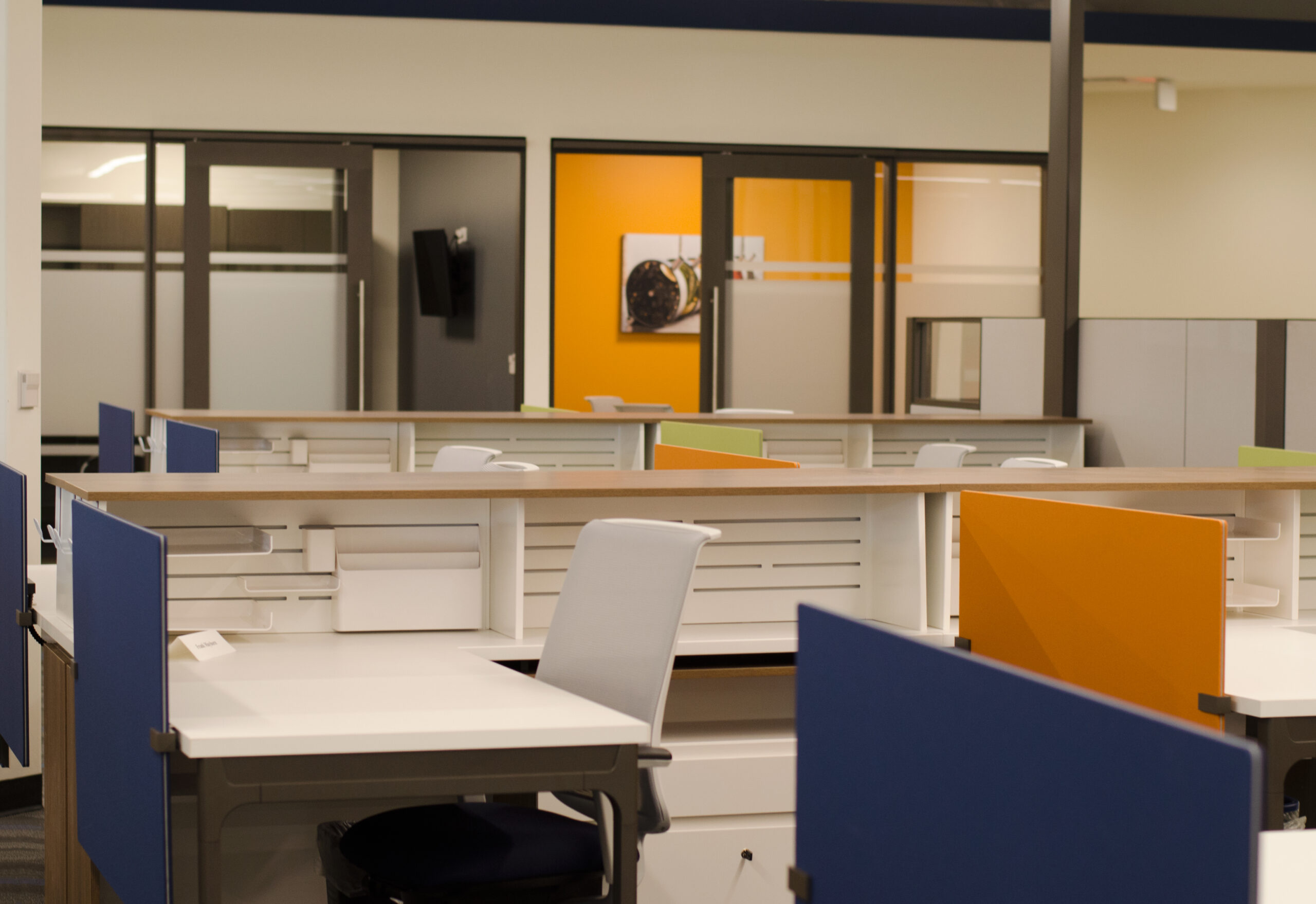 The King team worked with the owners to value engineer the Haworth Reside Beside Belong (RBB) line by using adaptable components mixed with RBB storage and accessories to create the new workstations. With pops of brand color in the screens, lowering the height of the typical panels and implementing a twist on sit to stand with the stanchions, the King team created a fun new culture for their employees.